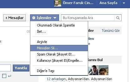 Şimdi asıl konuya gelelim. Mesajını silmek istediğiniz kişinin mesajının üstüne tıklayın. Ve mesajların olduğu pencere açıldı. Hemen sağ üst köşede altta fotoğraftaki gibi “ İşlemler ” menüsünün altında ” Mesajları Sil ” seçeneği var.